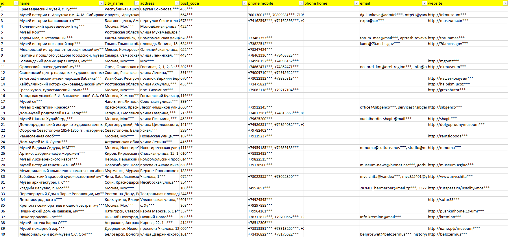 База компаний музеи, вся РФ в формате Excel с эл. почтами, телефонами, сайтами, ссылками на соц сети, координатами и другой информацией. Скачайте демо версию, чтобы ознакомиться с данными.