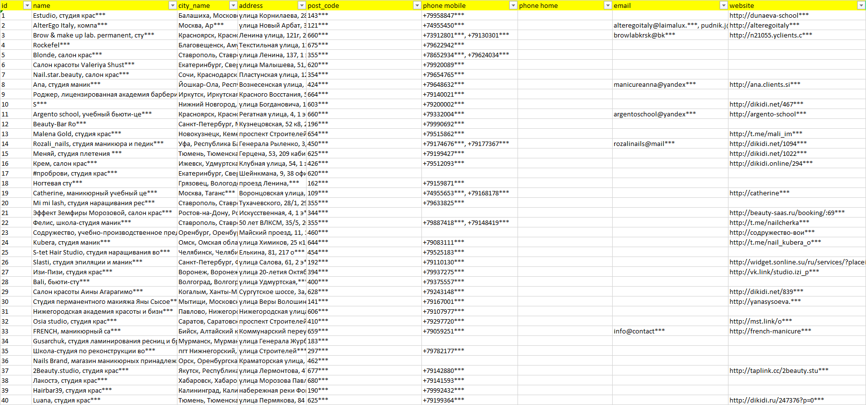База компаний обучение мастеров для салонов красоты, вся РФ в формате Excel с эл. почтами, телефонами, сайтами, ссылками на соц сети, координатами и другой информацией. Скачайте демо версию, чтобы ознакомиться с данными.