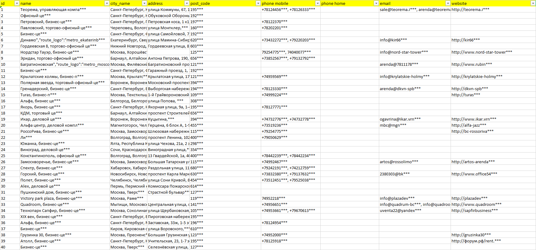 База компаний бизнес-центры, вся РФ в формате Excel с эл. почтами, телефонами, сайтами, ссылками на соц сети, координатами и другой информацией. Скачайте демо версию, чтобы ознакомиться с данными.