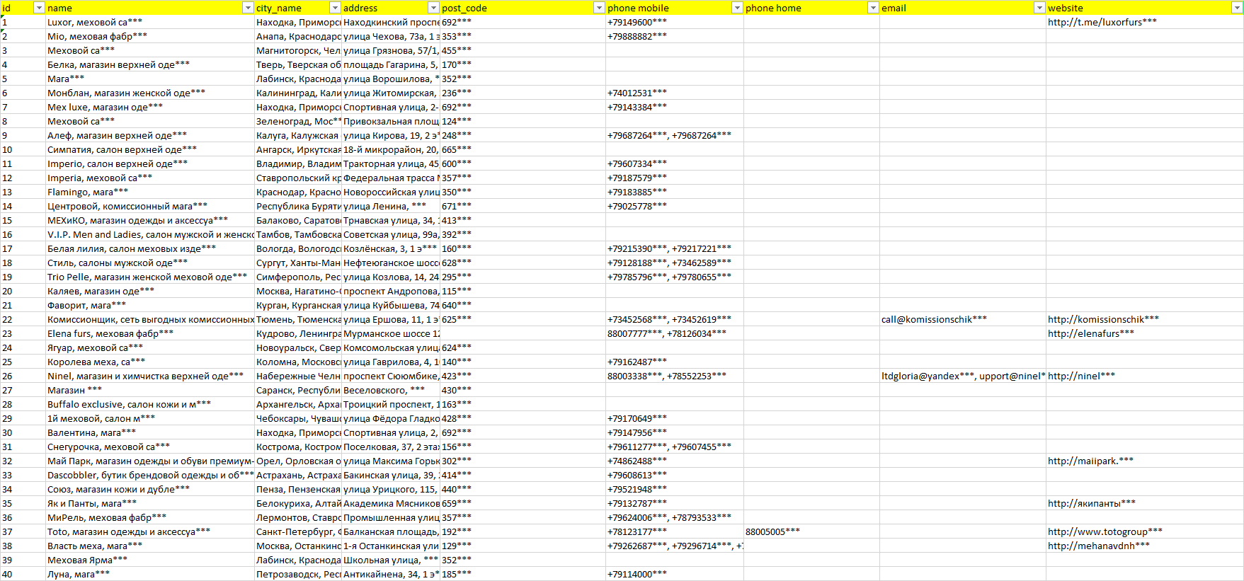 База организаций меха и кожа, вся Россия в формате Excel с эл. почтами, телефонами, сайтами, ссылками на соц сети, координатами и другой информацией. Скачайте демо версию, чтобы ознакомиться с данными.