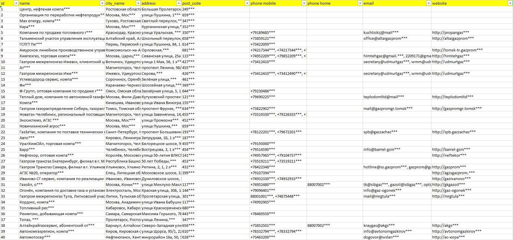 База компаний топливный газ, вся РФ в формате Excel с эл. почтами, телефонами, сайтами, ссылками на соц сети, координатами и другой информацией. Скачайте демо версию, чтобы ознакомиться с данными.