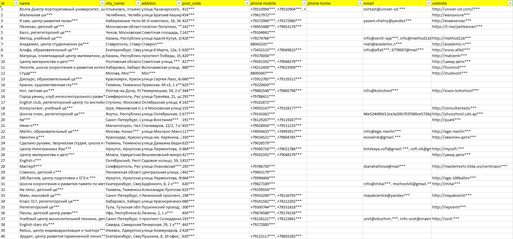 База компаний помощь в обучении, вся РФ в формате Excel с эл. почтами, телефонами, сайтами, ссылками на соц сети, координатами и другой информацией. Скачайте демо версию, чтобы ознакомиться с данными.