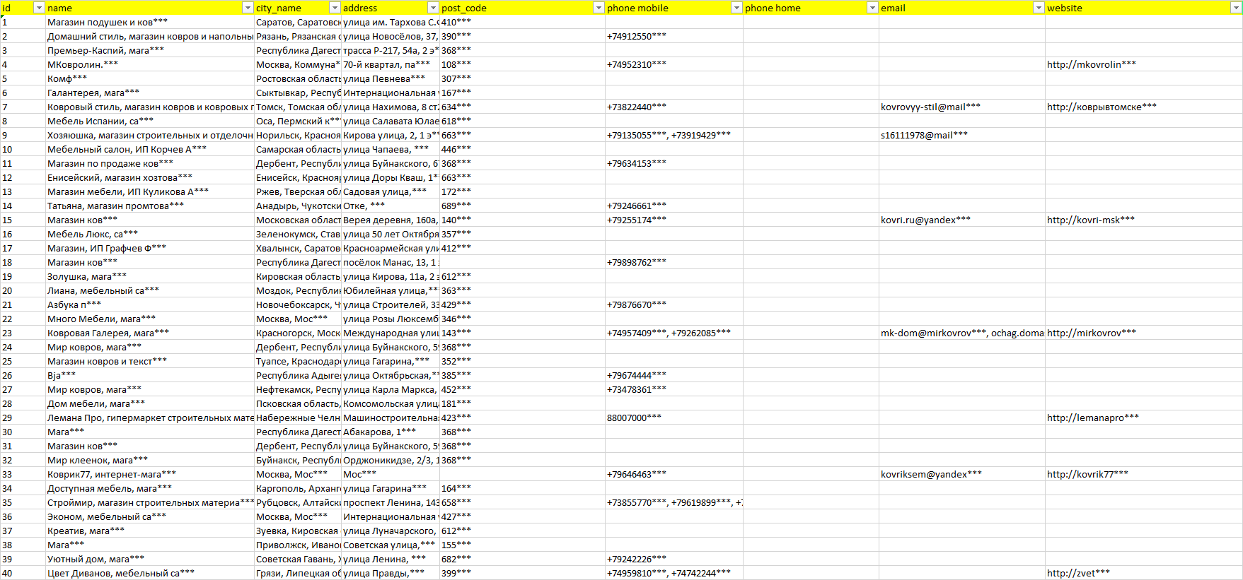 База компаний ковры, вся РФ в формате Excel с эл. почтами, телефонами, сайтами, ссылками на соц сети, координатами и другой информацией. Скачайте демо версию, чтобы ознакомиться с данными.