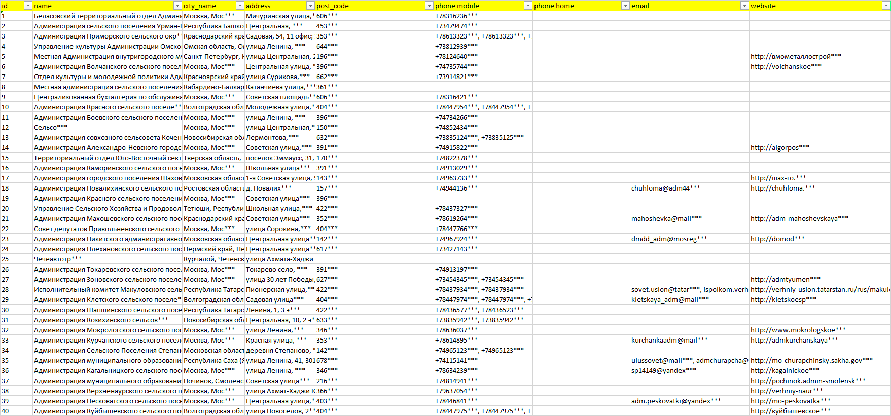 База организаций администрации поселений, вся Россия в формате Excel с эл. почтами, телефонами, сайтами, ссылками на соц сети, координатами и другой информацией. Скачайте демо версию, чтобы ознакомиться с данными.