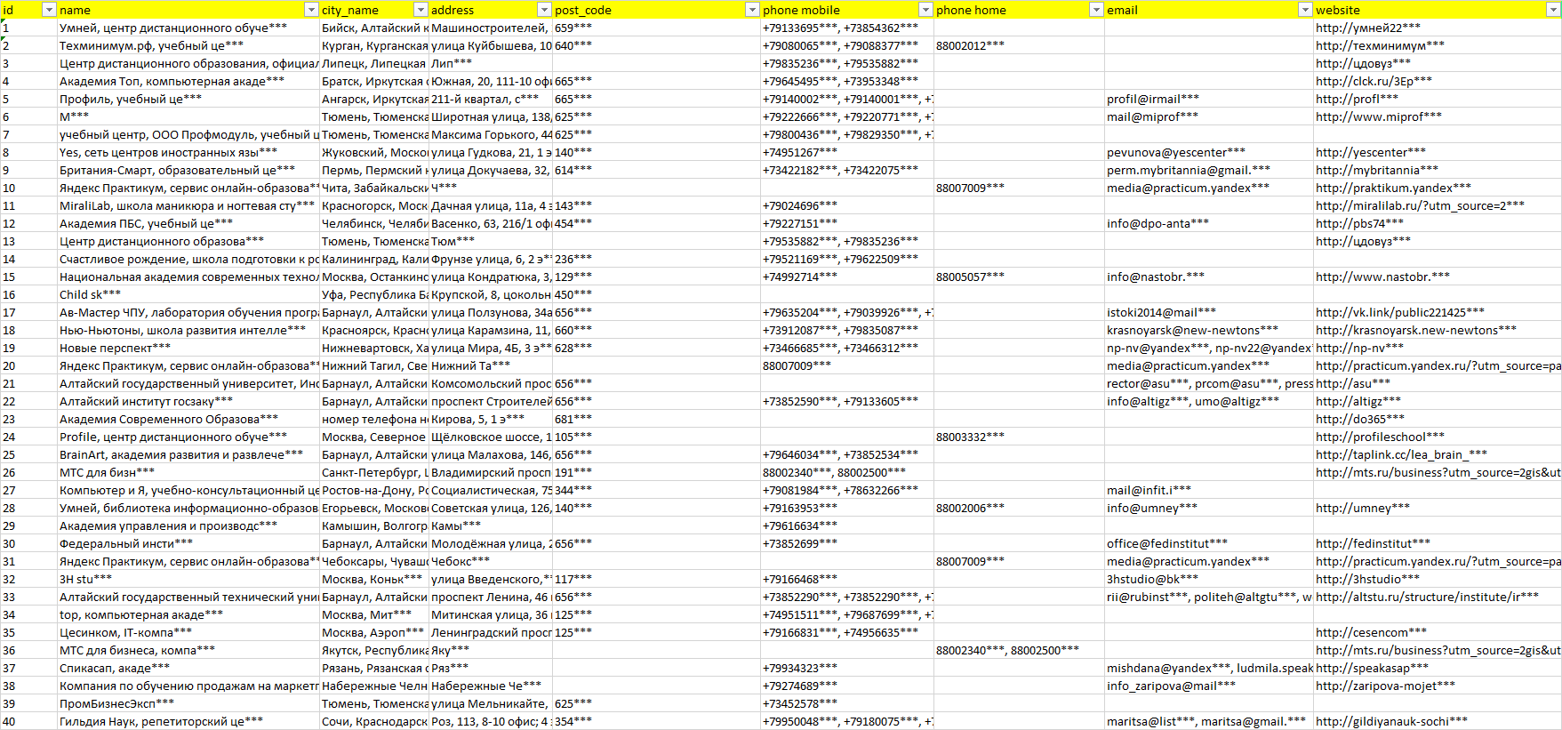 База компаний центры дистанционного обучения, вся РФ в формате Excel с эл. почтами, телефонами, сайтами, ссылками на соц сети, координатами и другой информацией. Скачайте демо версию, чтобы ознакомиться с данными.