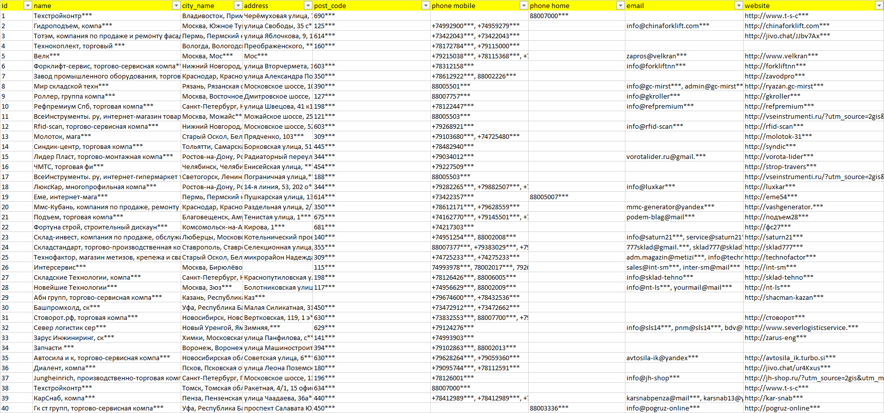 База компаний техника для склада, вся РФ в формате Excel с эл. почтами, телефонами, сайтами, ссылками на соц сети, координатами и другой информацией. Скачайте демо версию, чтобы ознакомиться с данными.