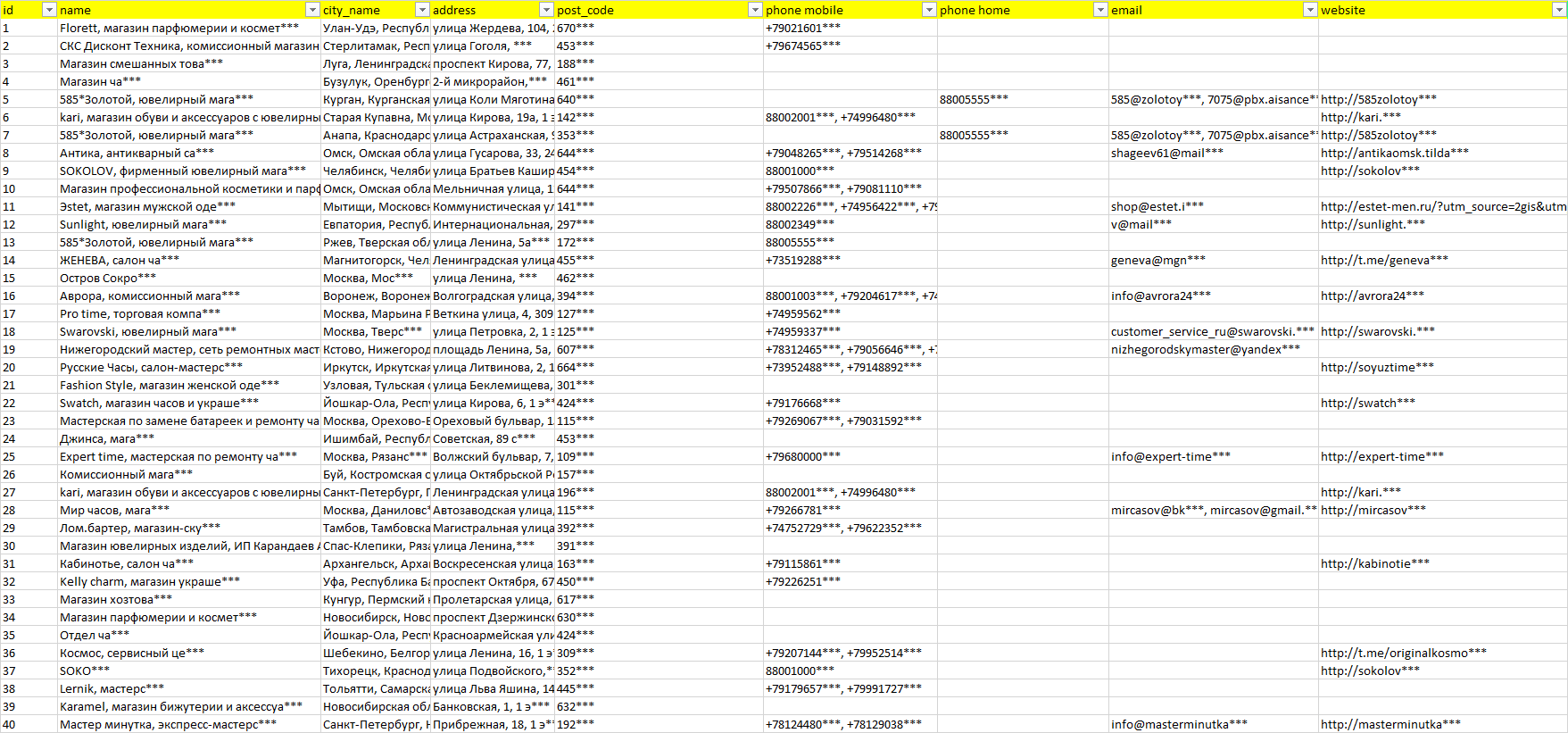 База организаций часы, вся Россия в формате Excel с эл. почтами, телефонами, сайтами, ссылками на соц сети, координатами и другой информацией. Скачайте демо версию, чтобы ознакомиться с данными.