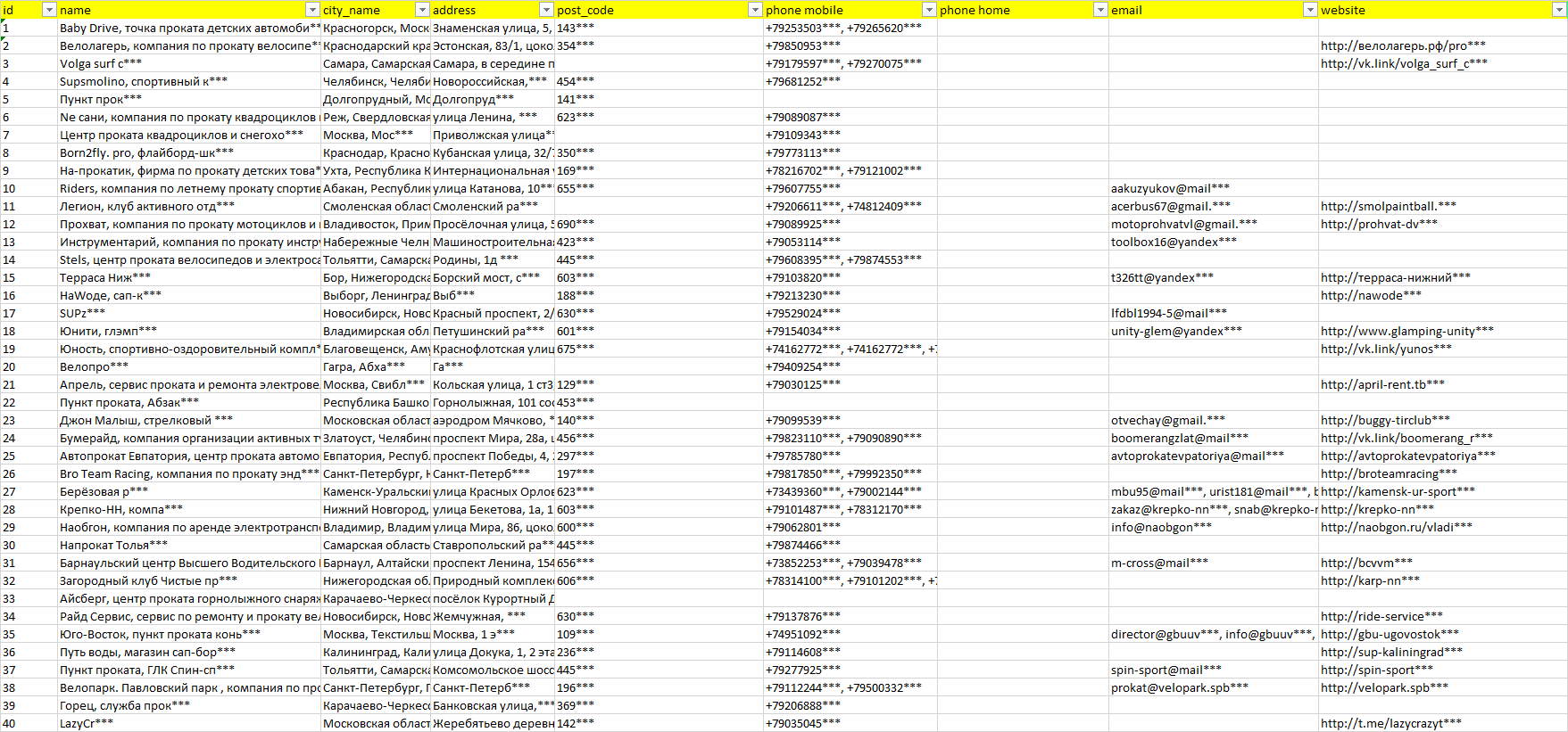 База компаний спортивный прокат, вся РФ в формате Excel с эл. почтами, телефонами, сайтами, ссылками на соц сети, координатами и другой информацией. Скачайте демо версию, чтобы ознакомиться с данными.