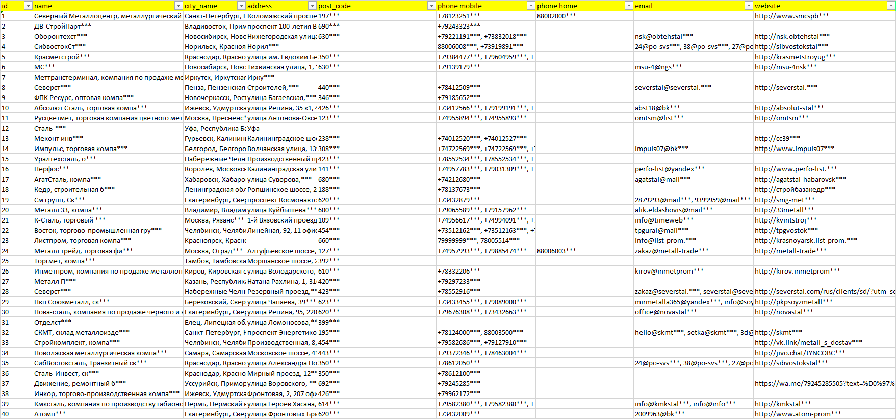Мы автоматически собираем такие данные с различных открытых источников, обрабатываем, структурирует и упорядочиваем их, предоставляя пользователю возможность скачать результат в формате Excel. По принципу работы наш сервис аналогичен поисковым системам, таким как Google или Яндекс, но с возможностью экспорта найденной информации в удобном табличном виде.
