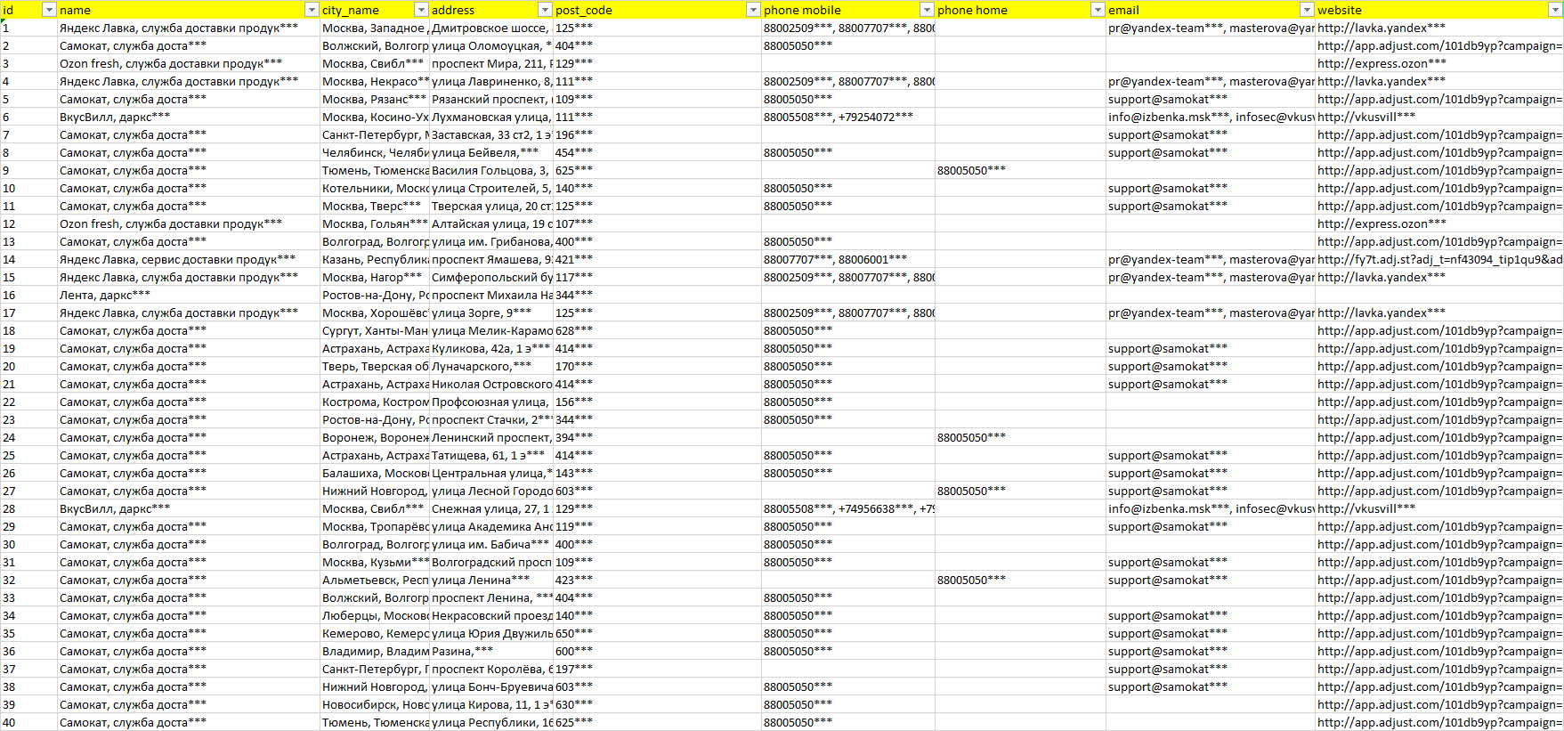 База компаний дарксторы, вся РФ в формате Excel с эл. почтами, телефонами, сайтами, ссылками на соц сети, координатами и другой информацией. Скачайте демо версию, чтобы ознакомиться с данными.