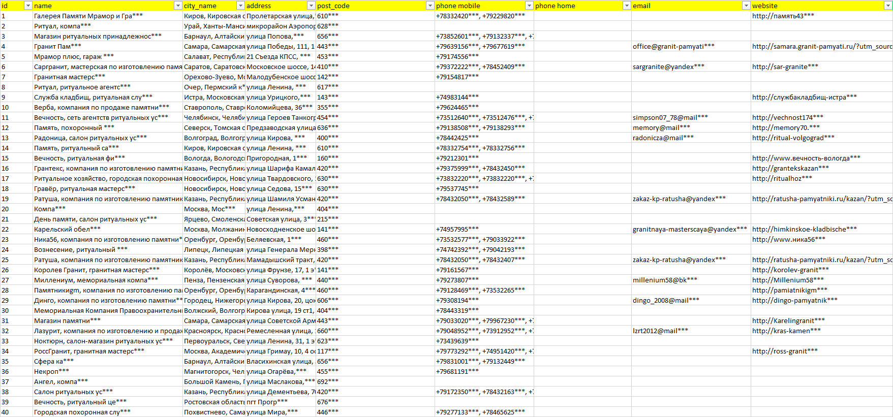 База организаций благоустройство мест захоронений, вся Россия в формате Excel с эл. почтами, телефонами, сайтами, ссылками на соц сети, координатами и другой информацией. Скачайте демо версию, чтобы ознакомиться с данными.