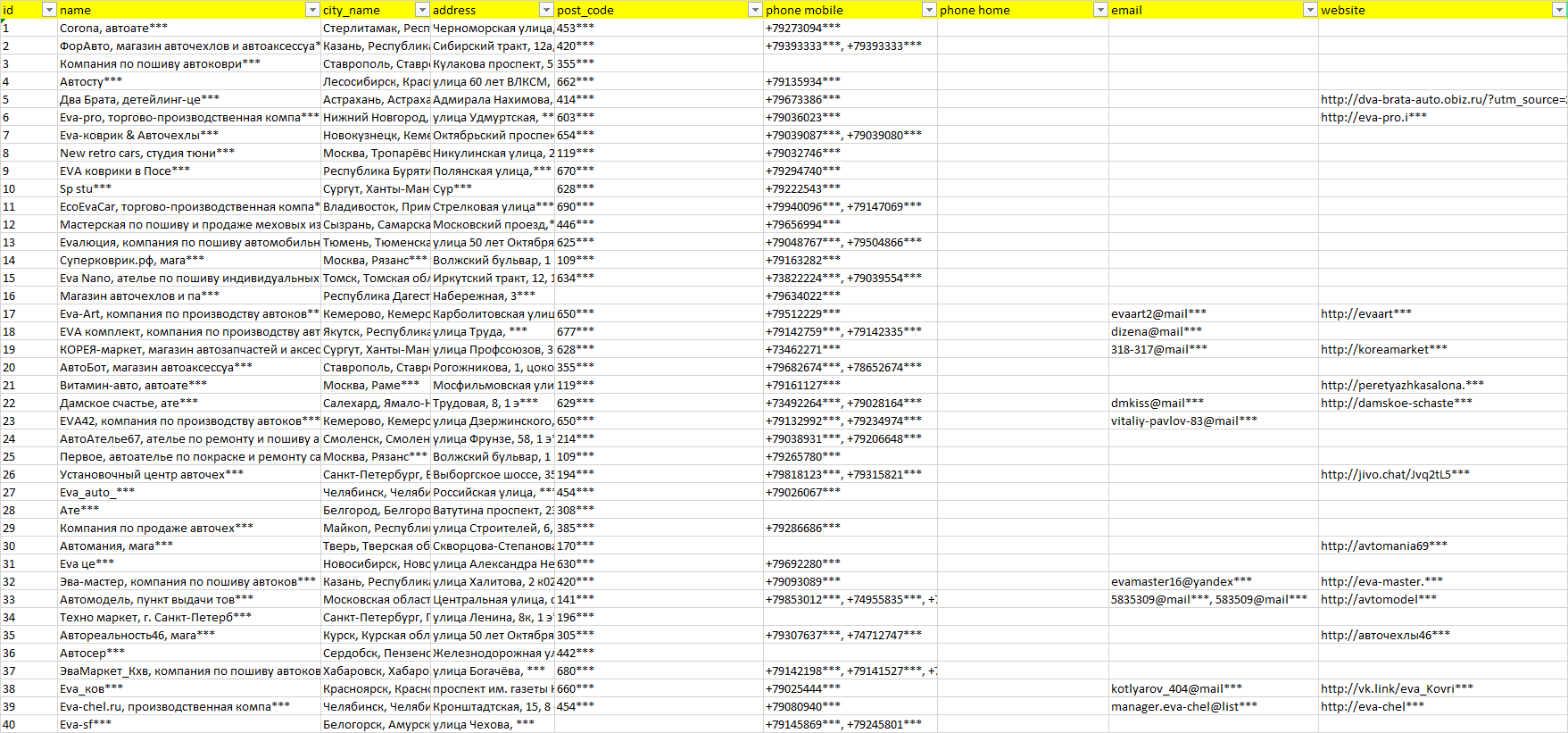 База компаний пошив автоковров, вся РФ в формате Excel с эл. почтами, телефонами, сайтами, ссылками на соц сети, координатами и другой информацией. Скачайте демо версию, чтобы ознакомиться с данными.