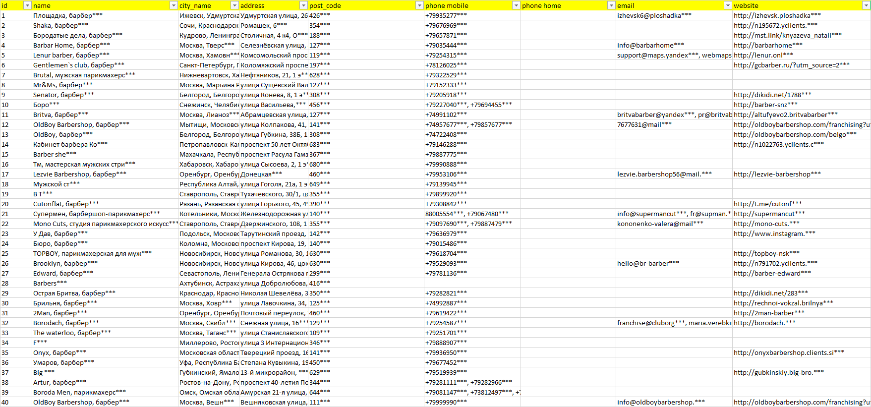 База компаний барбершопы, вся РФ в формате Excel с эл. почтами, телефонами, сайтами, ссылками на соц сети, координатами и другой информацией. Скачайте демо версию, чтобы ознакомиться с данными.