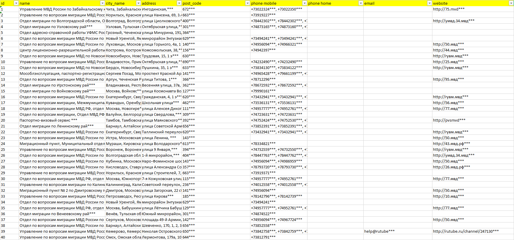 База организаций управления по вопросам миграции мвд рф, вся Россия в формате Excel с эл. почтами, телефонами, сайтами, ссылками на соц сети, координатами и другой информацией. Скачайте демо версию, чтобы ознакомиться с данными.