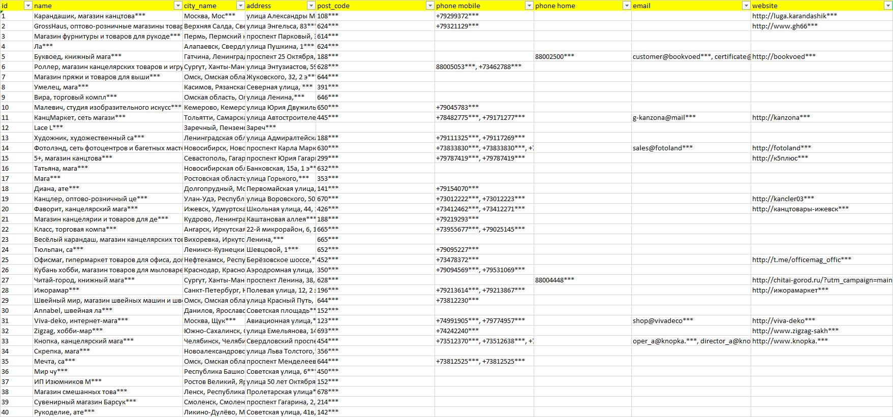 База организаций товары для творчества, вся Россия в формате Excel с эл. почтами, телефонами, сайтами, ссылками на соц сети, координатами и другой информацией. Скачайте демо версию, чтобы ознакомиться с данными.