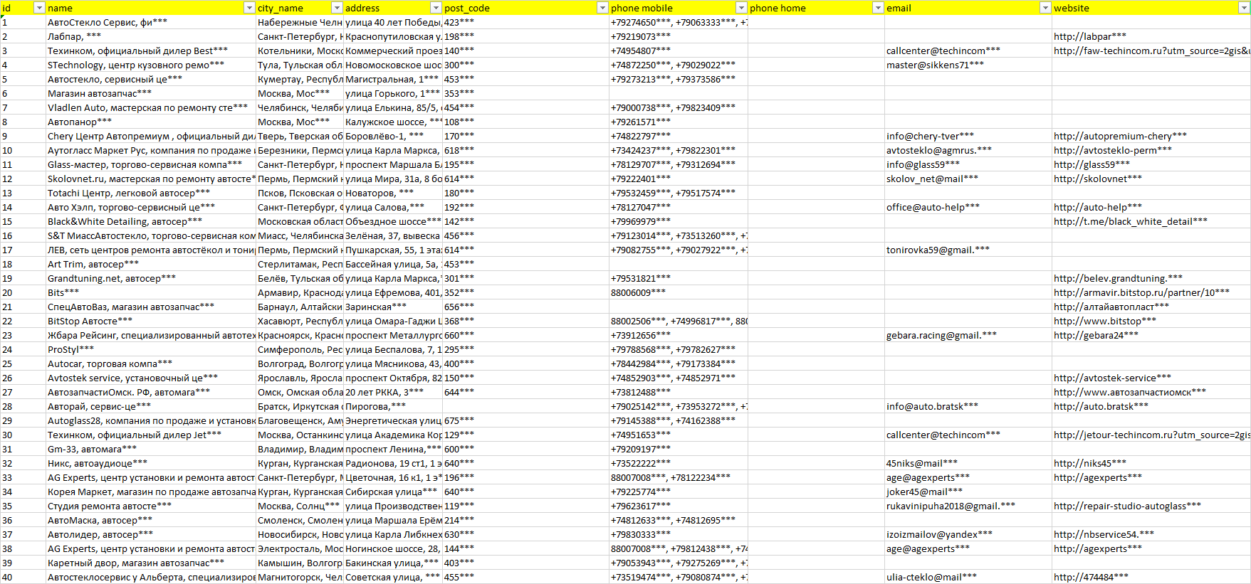 База компаний автостекло, вся РФ в формате Excel с эл. почтами, телефонами, сайтами, ссылками на соц сети, координатами и другой информацией. Скачайте демо версию, чтобы ознакомиться с данными.