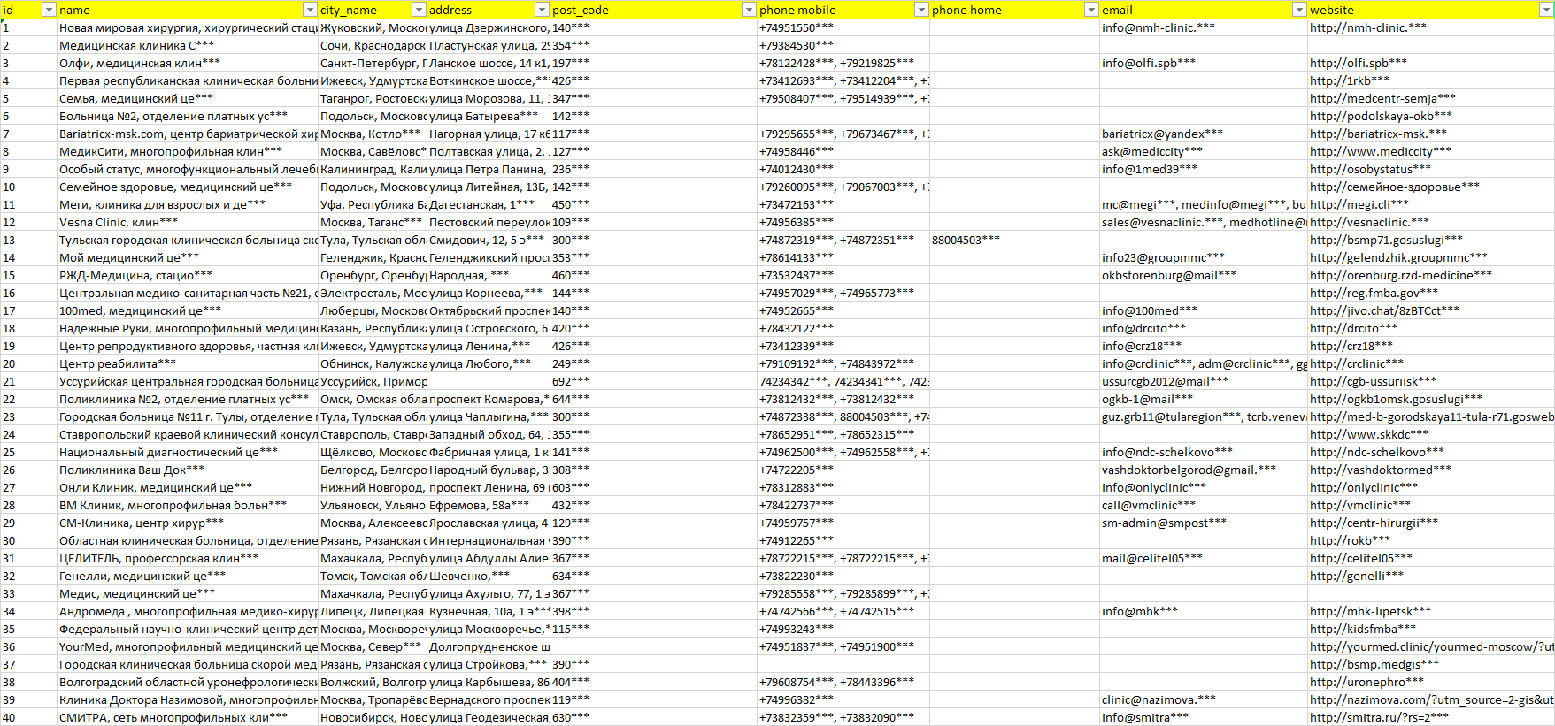 База компаний проведение хирургических операций, вся РФ в формате Excel с эл. почтами, телефонами, сайтами, ссылками на соц сети, координатами и другой информацией. Скачайте демо версию, чтобы ознакомиться с данными.
