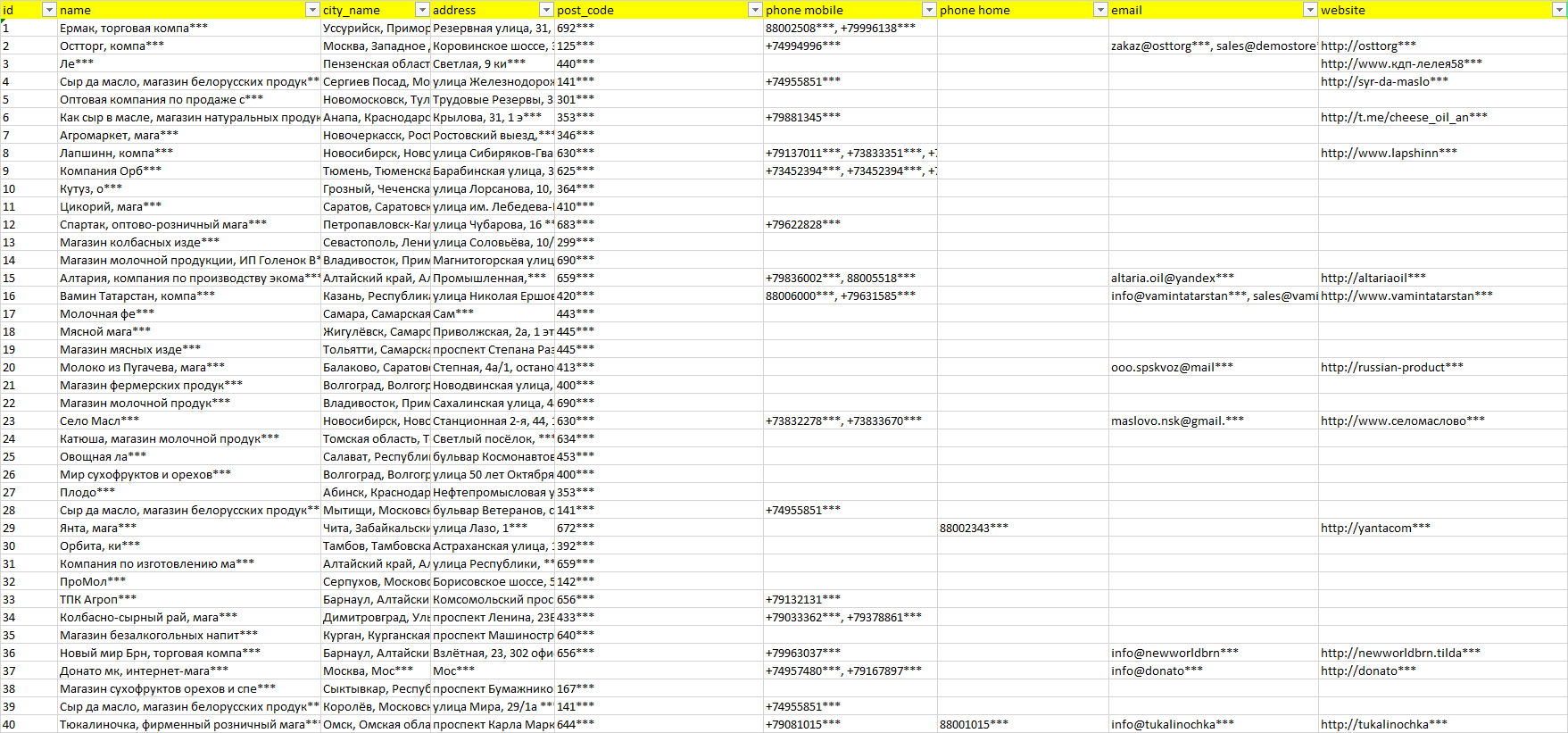База компаний жир и маслопродукты, вся РФ в формате Excel с эл. почтами, телефонами, сайтами, ссылками на соц сети, координатами и другой информацией. Скачайте демо версию, чтобы ознакомиться с данными.