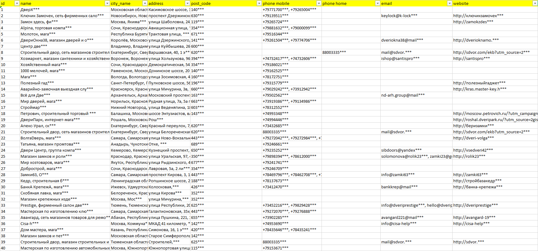 База компаний замки и скобяные изделия, вся РФ в формате Excel с эл. почтами, телефонами, сайтами, ссылками на соц сети, координатами и другой информацией. Скачайте демо версию, чтобы ознакомиться с данными.