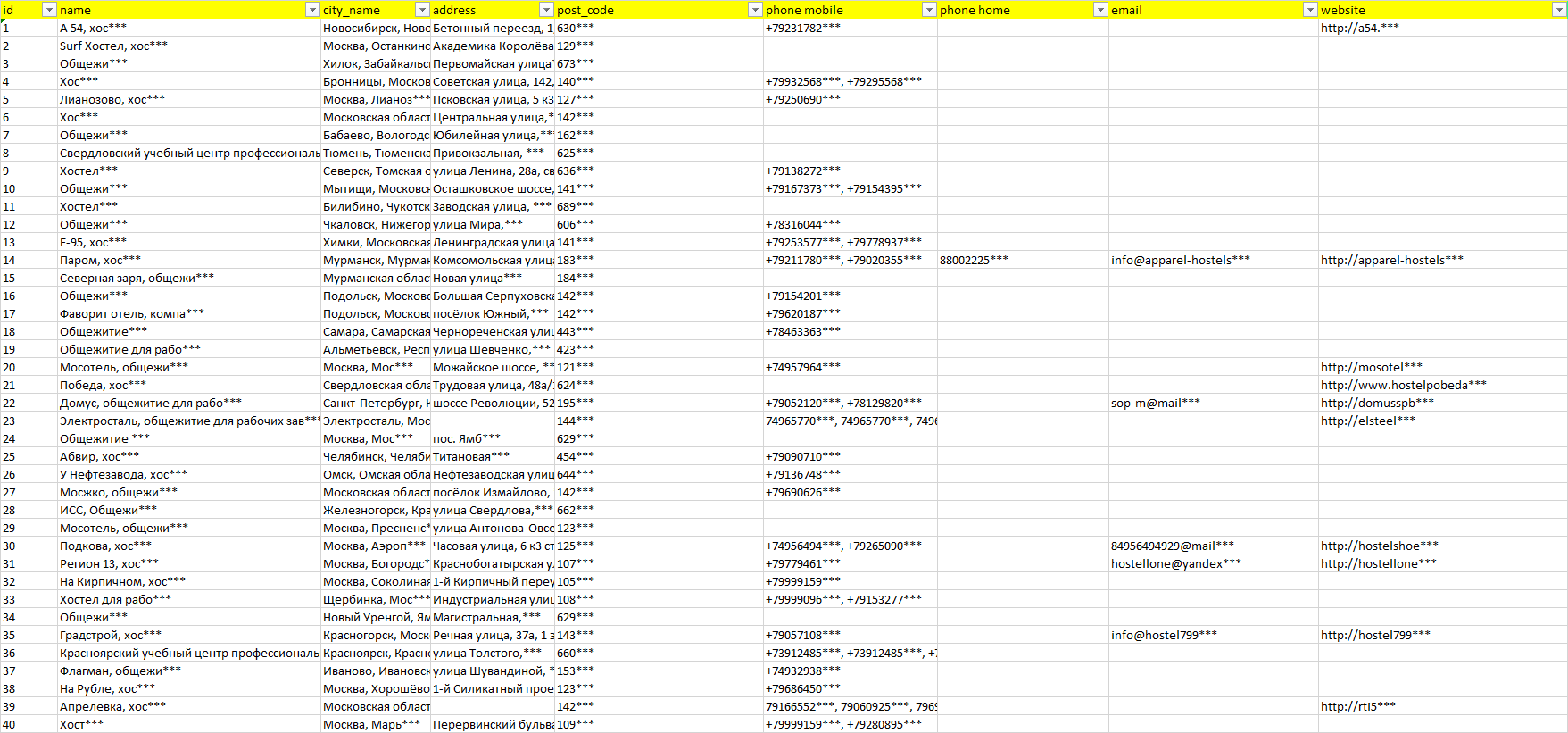 База организаций общежития для рабочих, вся Россия в формате Excel с эл. почтами, телефонами, сайтами, ссылками на соц сети, координатами и другой информацией. Скачайте демо версию, чтобы ознакомиться с данными.