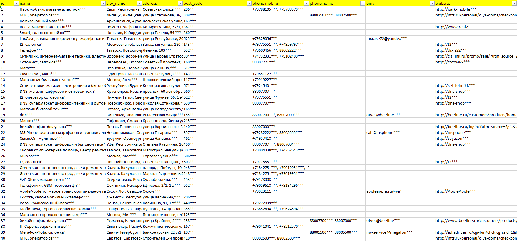 База организаций мобильные телефоны, вся Россия в формате Excel с эл. почтами, телефонами, сайтами, ссылками на соц сети, координатами и другой информацией. Скачайте демо версию, чтобы ознакомиться с данными.