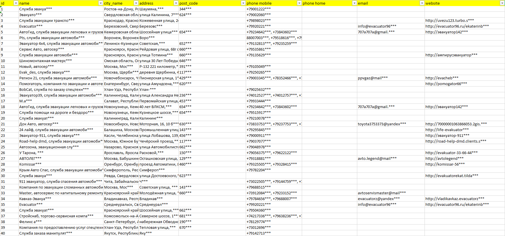 База организаций эвакуатор, вся Россия в формате Excel с эл. почтами, телефонами, сайтами, ссылками на соц сети, координатами и другой информацией. Скачайте демо версию, чтобы ознакомиться с данными.
