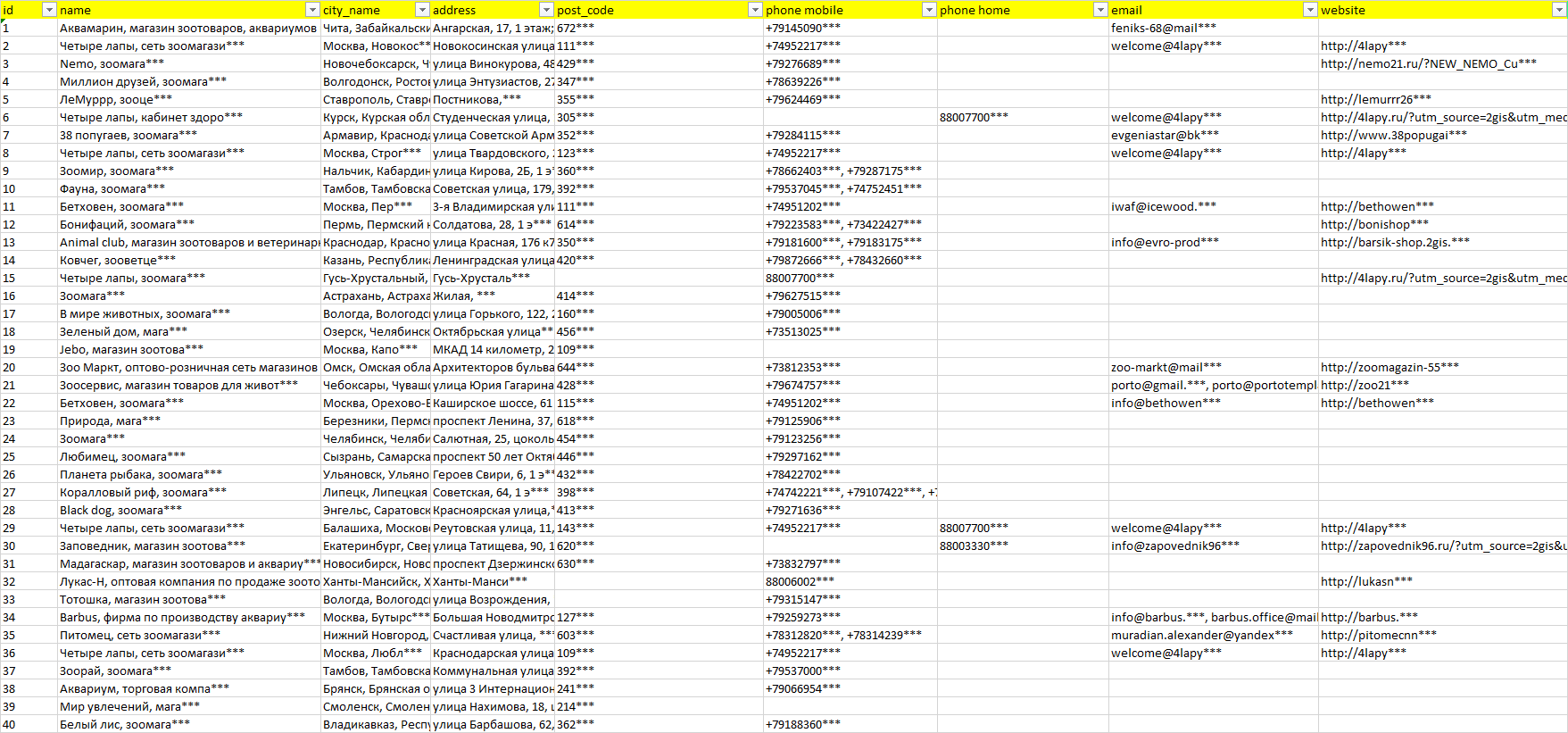 База организаций аквариумы, вся Россия в формате Excel с эл. почтами, телефонами, сайтами, ссылками на соц сети, координатами и другой информацией. Скачайте демо версию, чтобы ознакомиться с данными.