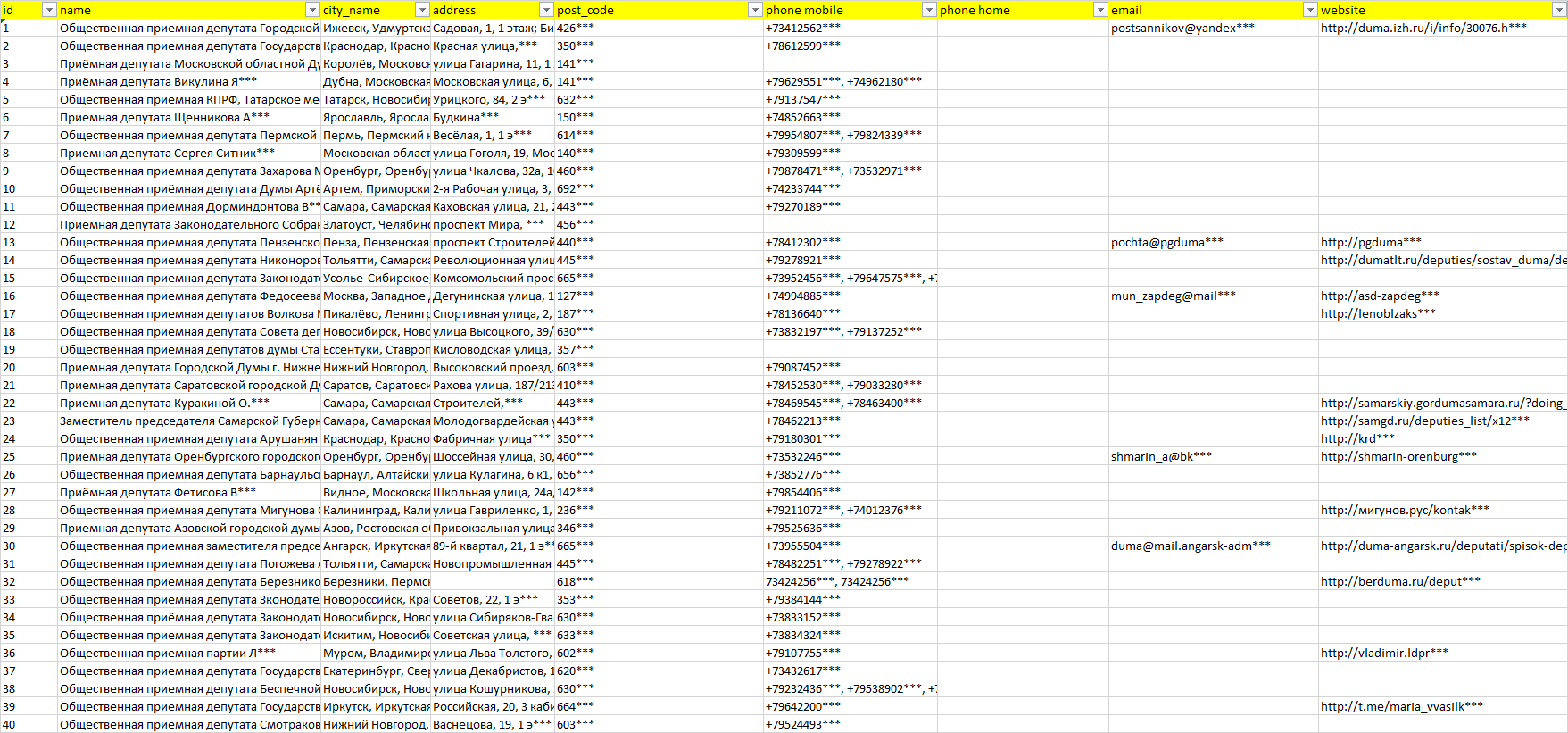 База организаций приёмные депутатов, вся Россия в формате Excel с эл. почтами, телефонами, сайтами, ссылками на соц сети, координатами и другой информацией. Скачайте демо версию, чтобы ознакомиться с данными.