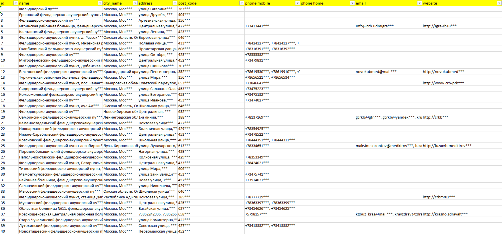 База организаций фельдшерско-акушерские пункты, вся Россия в формате Excel с эл. почтами, телефонами, сайтами, ссылками на соц сети, координатами и другой информацией. Скачайте демо версию, чтобы ознакомиться с данными.