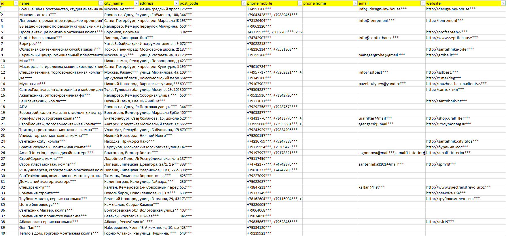 База компаний монтаж сантехнического оборудования, вся РФ в формате Excel с эл. почтами, телефонами, сайтами, ссылками на соц сети, координатами и другой информацией. Скачайте демо версию, чтобы ознакомиться с данными.