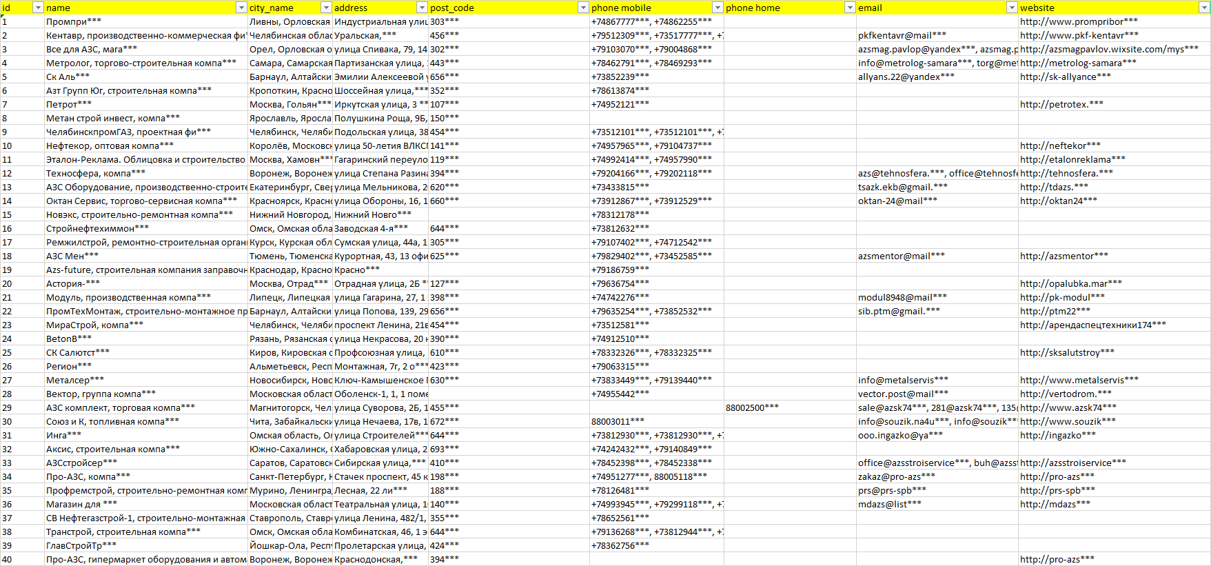 База компаний строительство азс, вся РФ в формате Excel с эл. почтами, телефонами, сайтами, ссылками на соц сети, координатами и другой информацией. Скачайте демо версию, чтобы ознакомиться с данными.