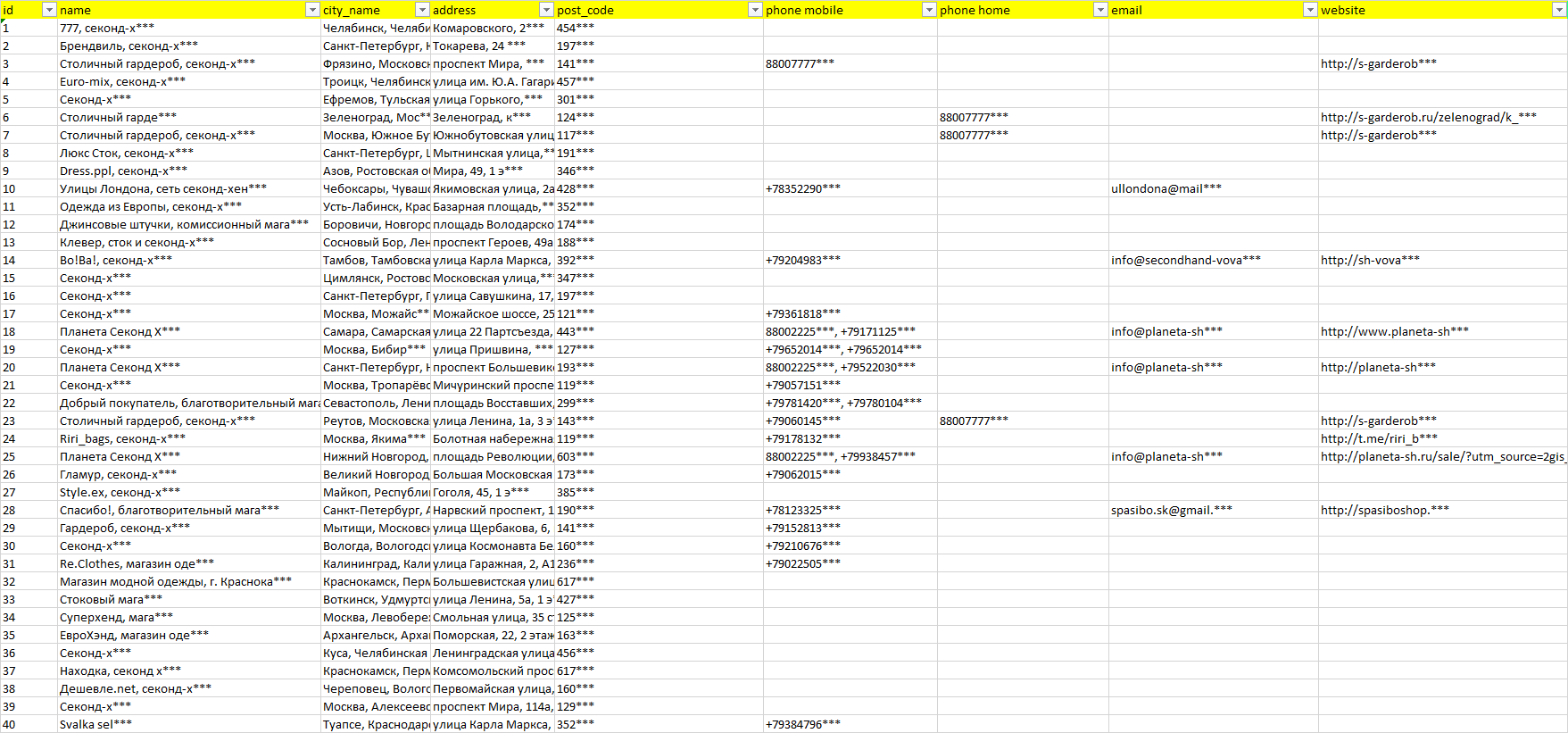 База организаций секонд-хенд, вся Россия в формате Excel с эл. почтами, телефонами, сайтами, ссылками на соц сети, координатами и другой информацией. Скачайте демо версию, чтобы ознакомиться с данными.