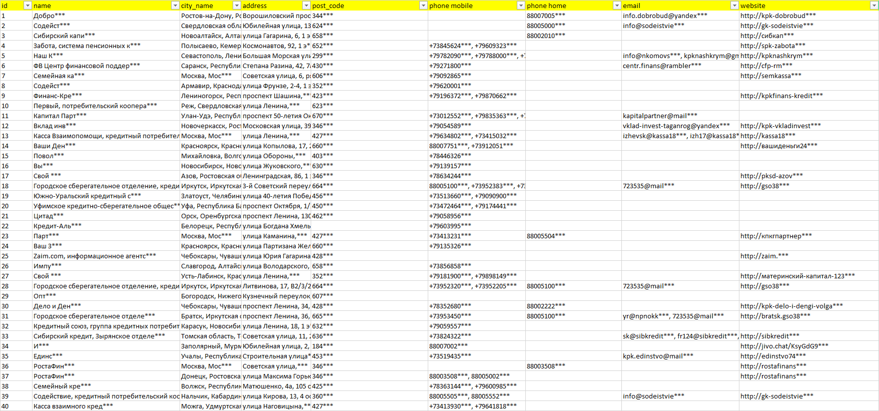 База компаний кредитные потребительские кооперативы, вся РФ в формате Excel с эл. почтами, телефонами, сайтами, ссылками на соц сети, координатами и другой информацией. Скачайте демо версию, чтобы ознакомиться с данными.