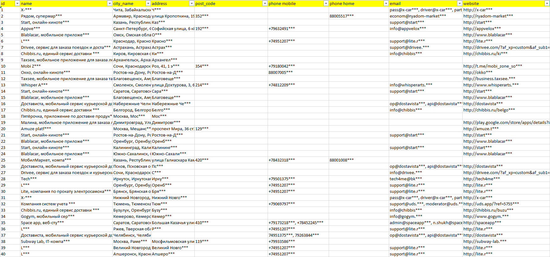 База организаций мобильные приложения, вся Россия в формате Excel с эл. почтами, телефонами, сайтами, ссылками на соц сети, координатами и другой информацией. Скачайте демо версию, чтобы ознакомиться с данными.