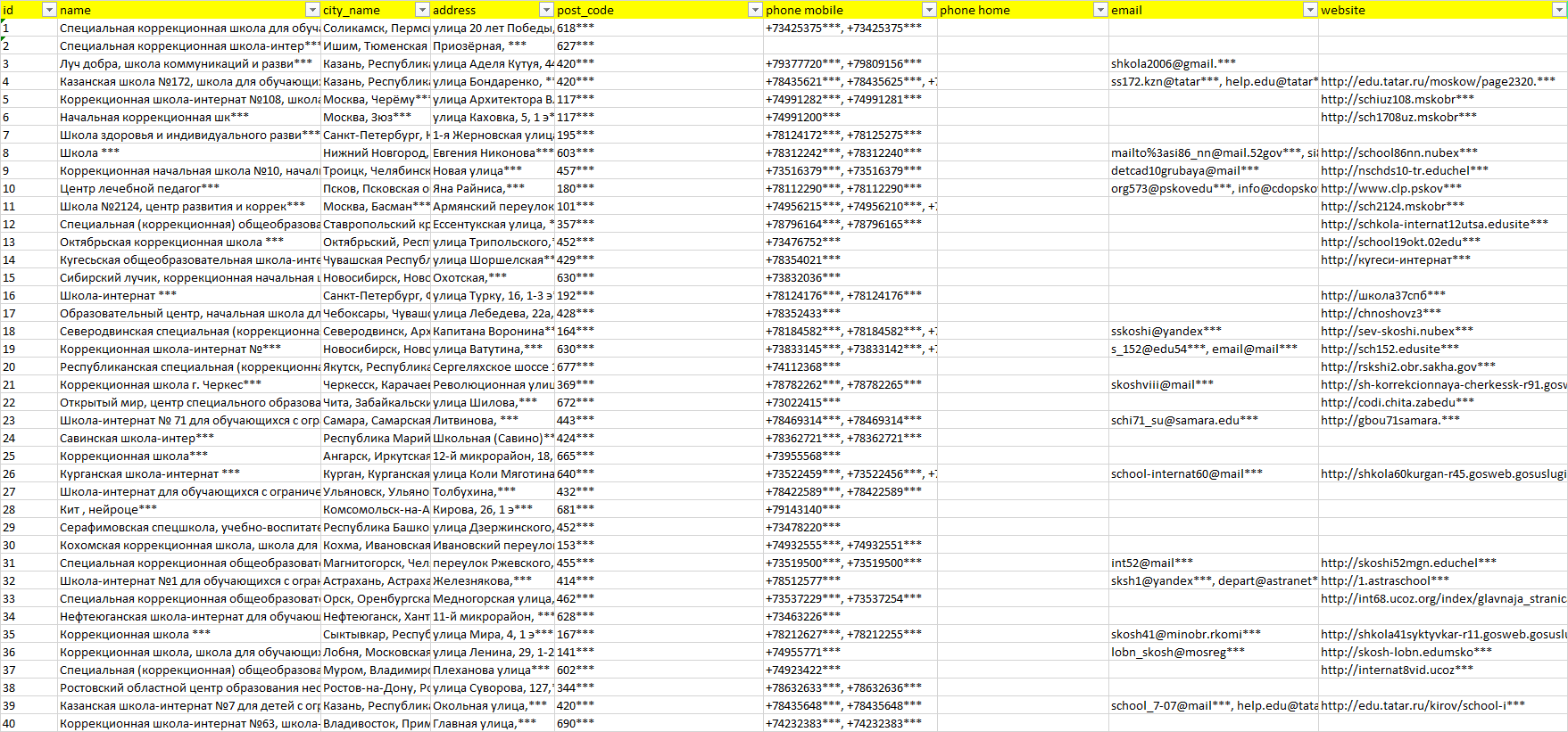 База организаций специальные школы, вся Россия в формате Excel с эл. почтами, телефонами, сайтами, ссылками на соц сети, координатами и другой информацией. Скачайте демо версию, чтобы ознакомиться с данными.