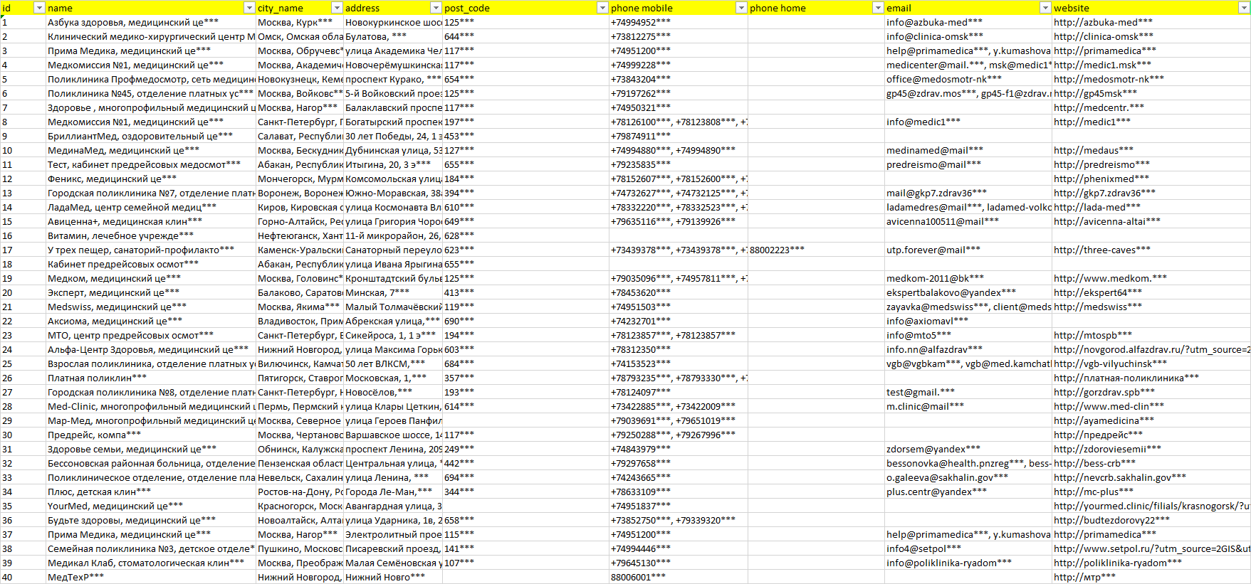 База организаций медицинские комиссии, вся Россия в формате Excel с эл. почтами, телефонами, сайтами, ссылками на соц сети, координатами и другой информацией. Скачайте демо версию, чтобы ознакомиться с данными.