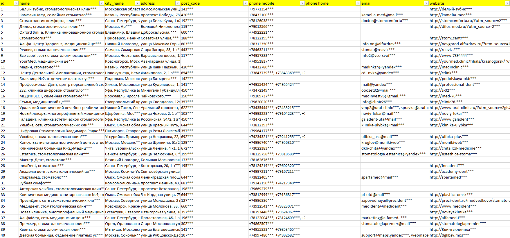 База организаций челюстно-лицевой хирург, вся Россия в формате Excel с эл. почтами, телефонами, сайтами, ссылками на соц сети, координатами и другой информацией. Скачайте демо версию, чтобы ознакомиться с данными.
