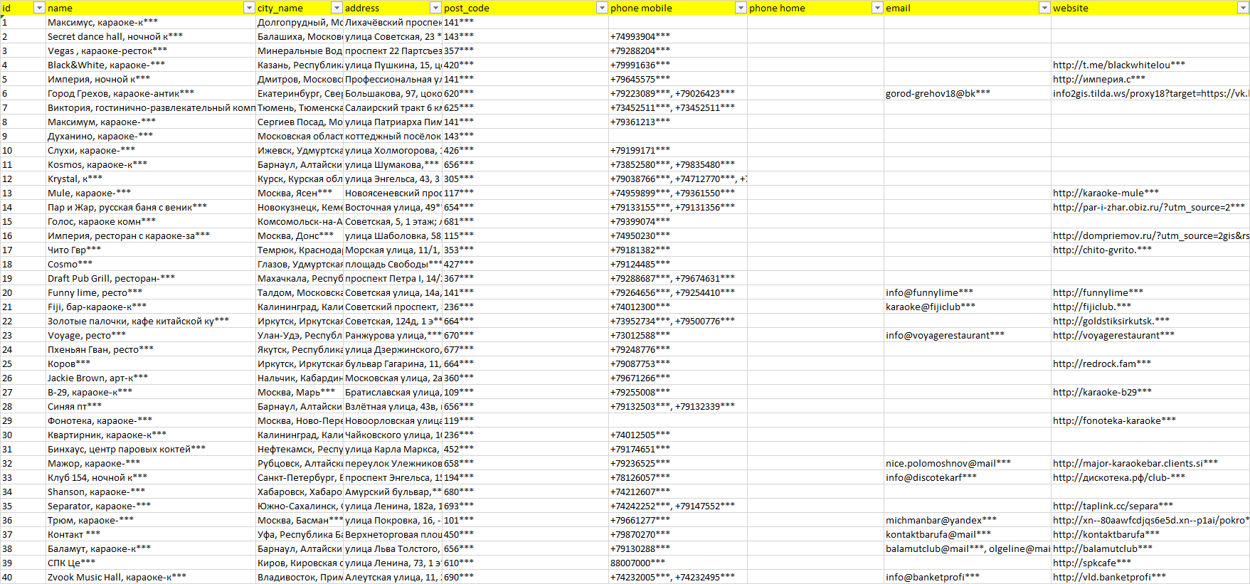База компаний караоке-залы, вся РФ в формате Excel с эл. почтами, телефонами, сайтами, ссылками на соц сети, координатами и другой информацией. Скачайте демо версию, чтобы ознакомиться с данными.