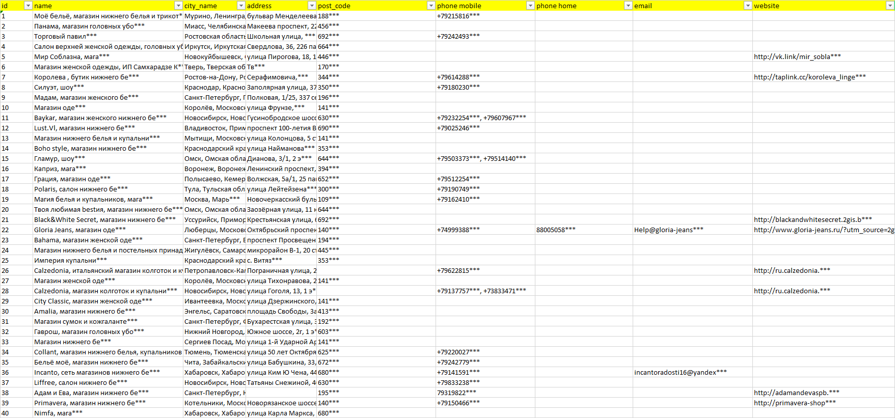 База компаний купальники, вся РФ в формате Excel с эл. почтами, телефонами, сайтами, ссылками на соц сети, координатами и другой информацией. Скачайте демо версию, чтобы ознакомиться с данными.
