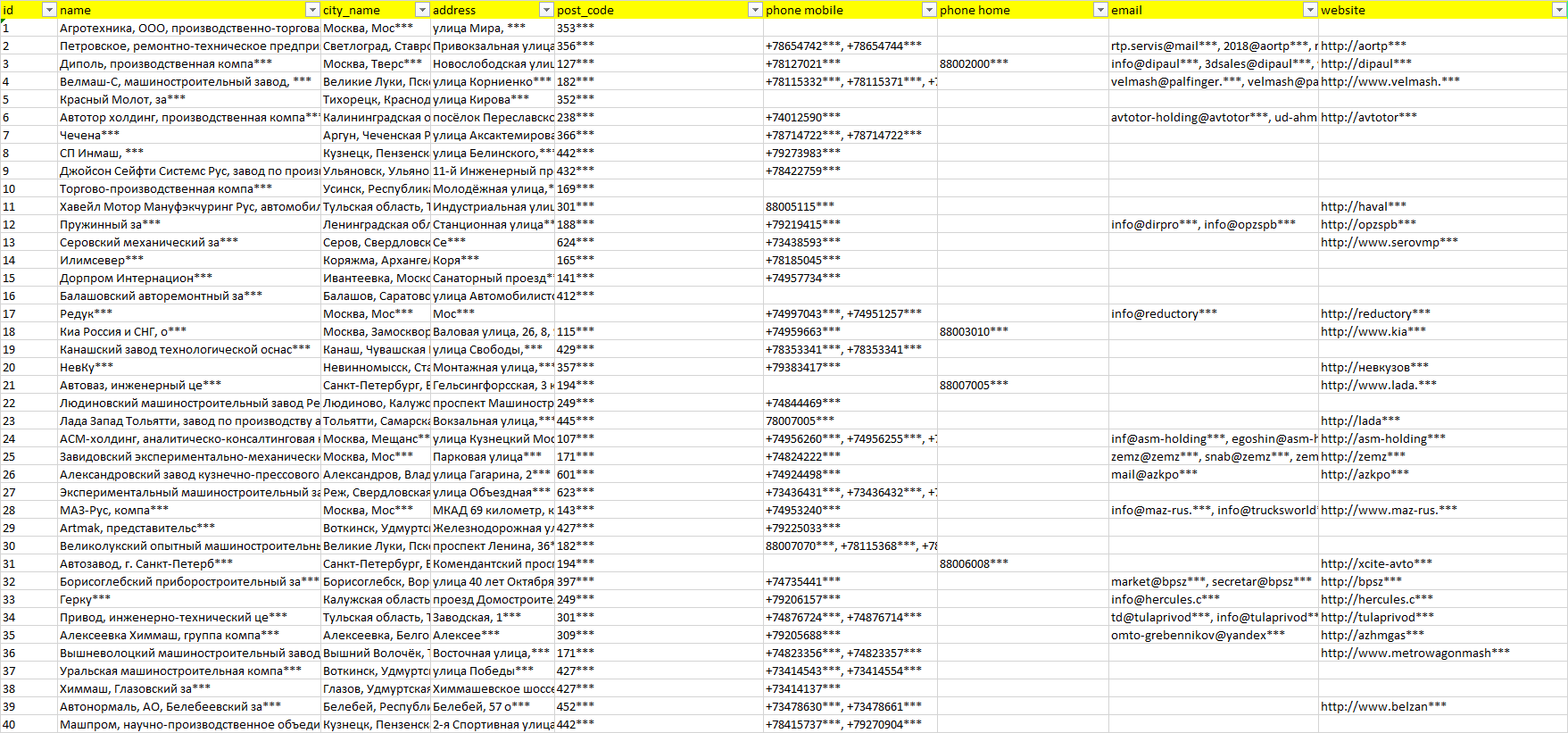 База организаций автомобилестроение, вся Россия в формате Excel с эл. почтами, телефонами, сайтами, ссылками на соц сети, координатами и другой информацией. Скачайте демо версию, чтобы ознакомиться с данными.