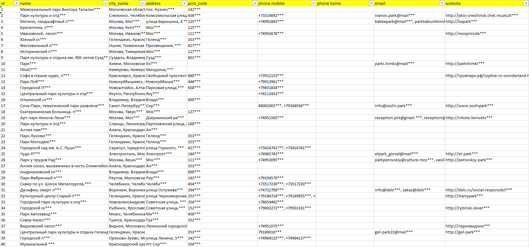 База компаний парки, вся РФ в формате Excel с эл. почтами, телефонами, сайтами, ссылками на соц сети, координатами и другой информацией. Скачайте демо версию, чтобы ознакомиться с данными.