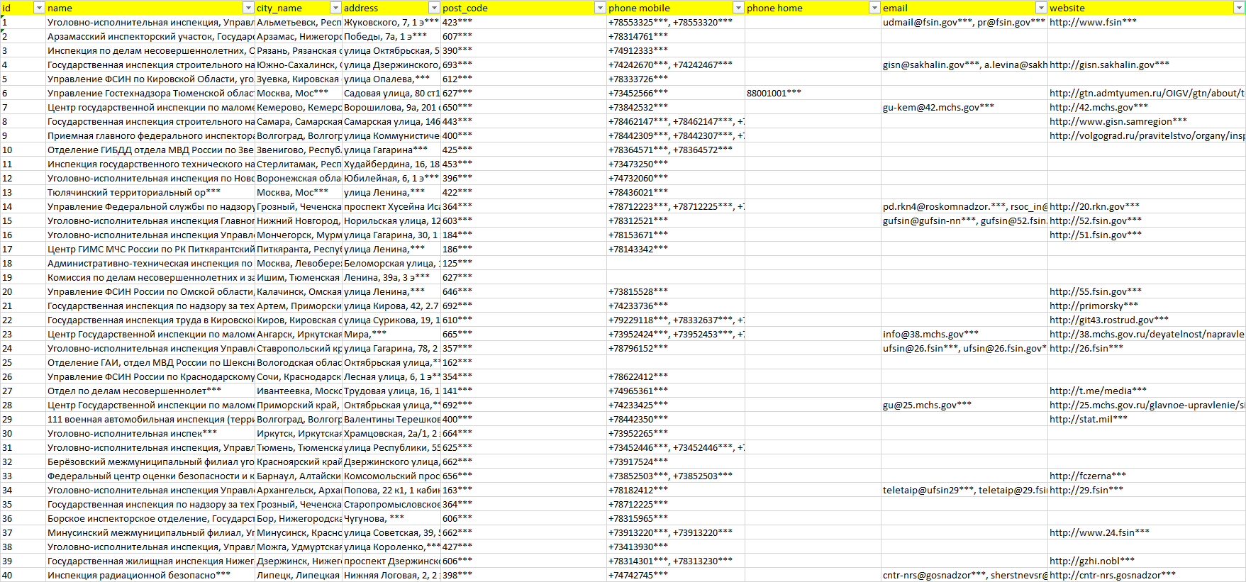 База компаний инспекции, вся РФ в формате Excel с эл. почтами, телефонами, сайтами, ссылками на соц сети, координатами и другой информацией. Скачайте демо версию, чтобы ознакомиться с данными.