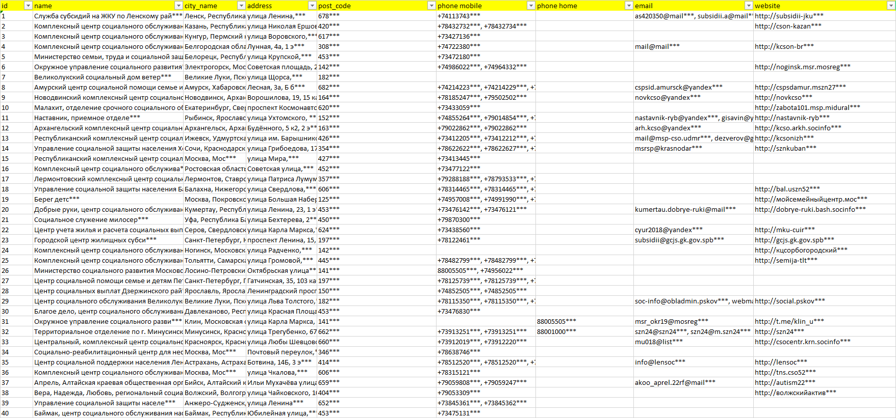 База организаций социальные службы, вся Россия в формате Excel с эл. почтами, телефонами, сайтами, ссылками на соц сети, координатами и другой информацией. Скачайте демо версию, чтобы ознакомиться с данными.