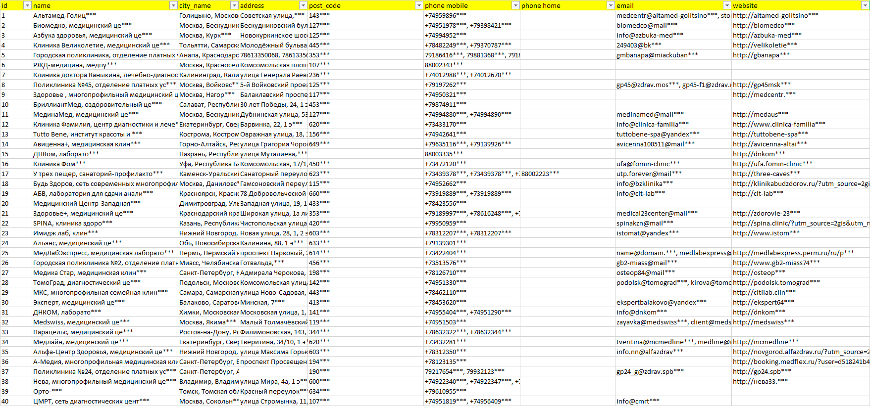 База организаций процедурный кабинет, вся Россия в формате Excel с эл. почтами, телефонами, сайтами, ссылками на соц сети, координатами и другой информацией. Скачайте демо версию, чтобы ознакомиться с данными.