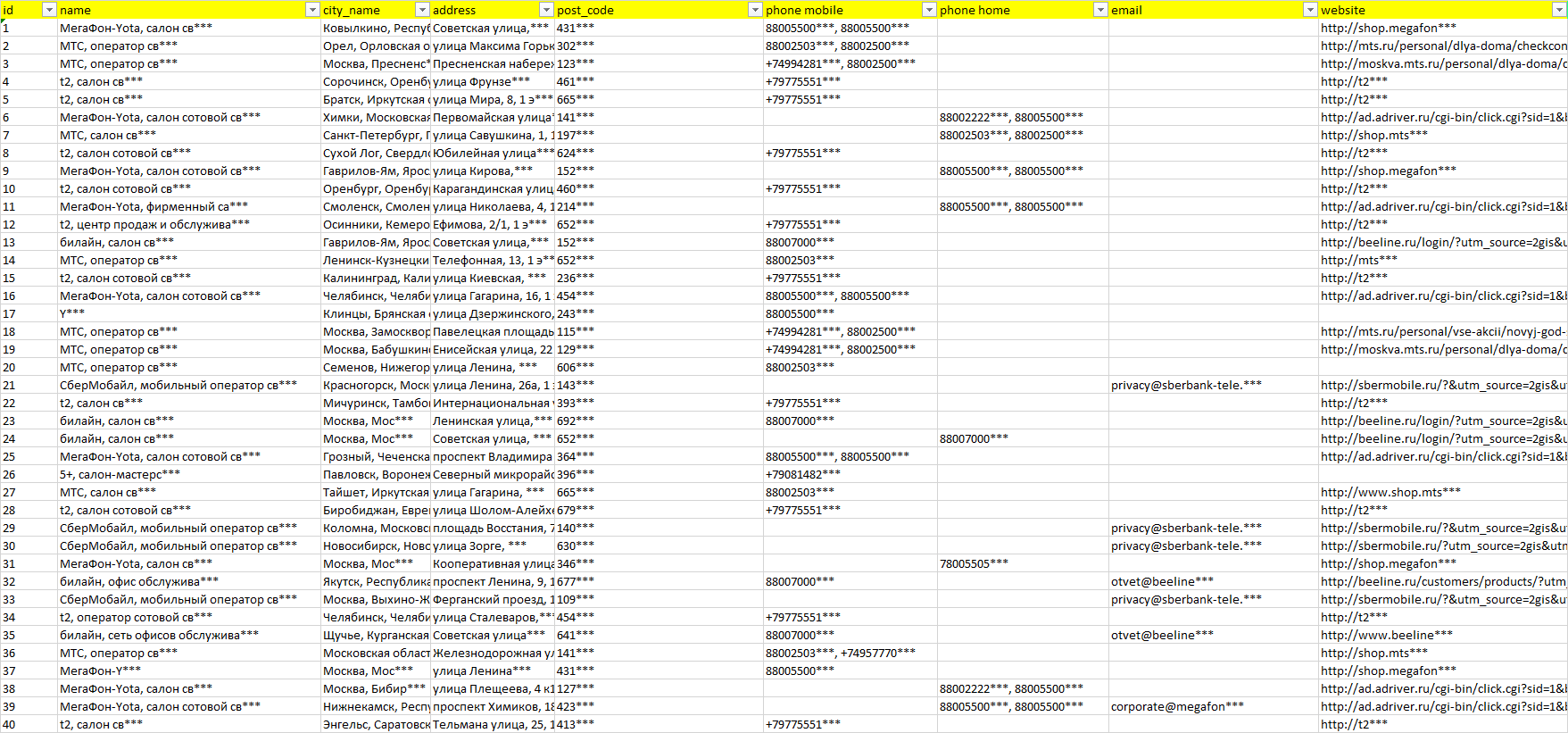 База организаций мобильные операторы, вся Россия в формате Excel с эл. почтами, телефонами, сайтами, ссылками на соц сети, координатами и другой информацией. Скачайте демо версию, чтобы ознакомиться с данными.