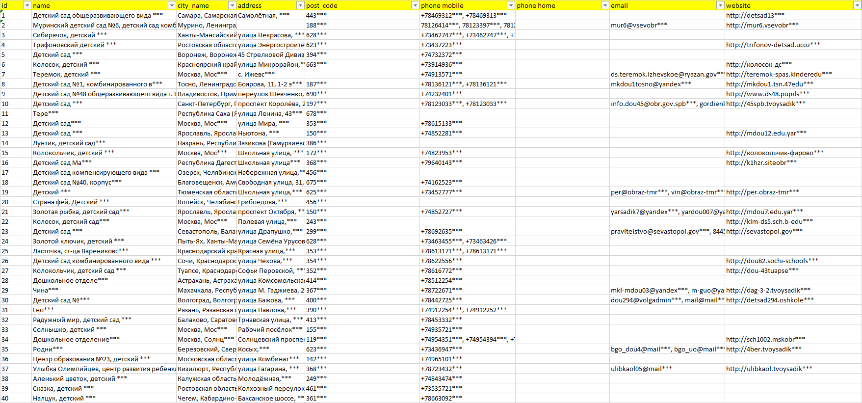 База компаний детские сады, вся РФ в формате Excel с эл. почтами, телефонами, сайтами, ссылками на соц сети, координатами и другой информацией. Скачайте демо версию, чтобы ознакомиться с данными.