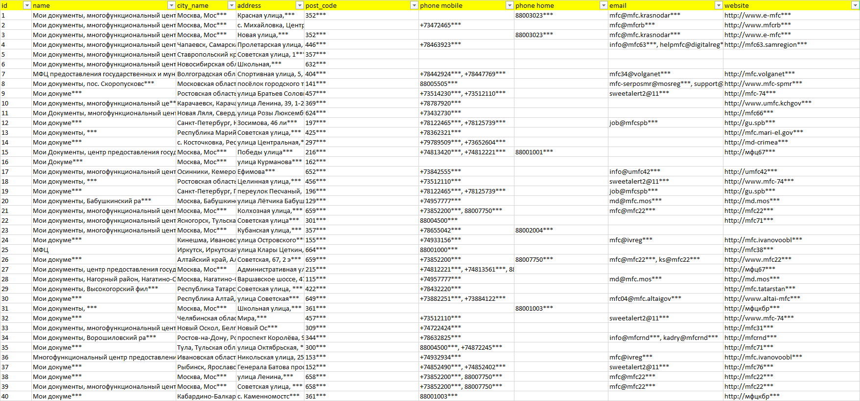 База организаций мфц, вся Россия в формате Excel с эл. почтами, телефонами, сайтами, ссылками на соц сети, координатами и другой информацией. Скачайте демо версию, чтобы ознакомиться с данными.