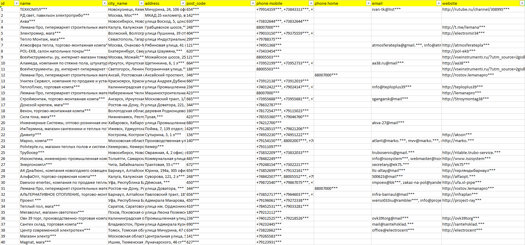 База компаний тёплые полы, вся РФ в формате Excel с эл. почтами, телефонами, сайтами, ссылками на соц сети, координатами и другой информацией. Скачайте демо версию, чтобы ознакомиться с данными.