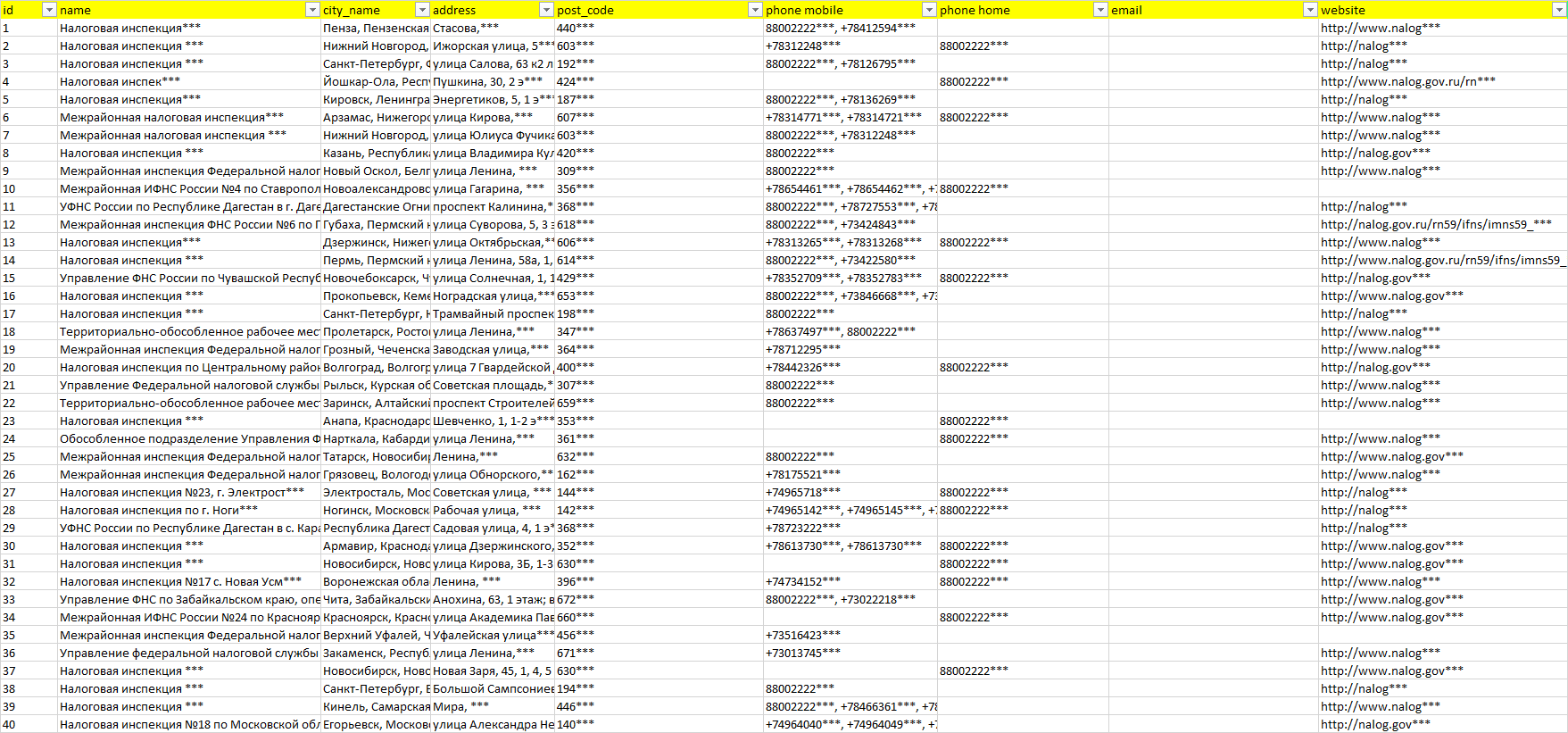 База организаций налоговые инспекции, вся Россия в формате Excel с эл. почтами, телефонами, сайтами, ссылками на соц сети, координатами и другой информацией. Скачайте демо версию, чтобы ознакомиться с данными.