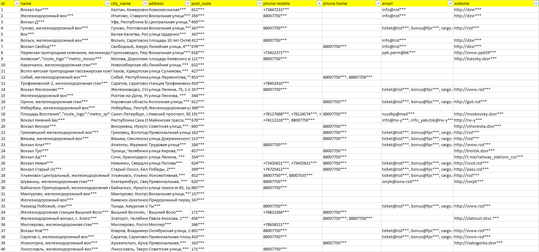 База компаний железнодорожные вокзалы, вся РФ в формате Excel с эл. почтами, телефонами, сайтами, ссылками на соц сети, координатами и другой информацией. Скачайте демо версию, чтобы ознакомиться с данными.